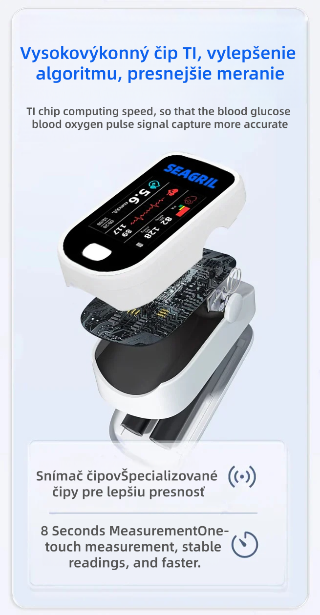 Úplne bezbolestné – stačí položiť ukazovák na SEAGRIL™ a do 8 sekúnd sa zobrazí hladina glukózy v krvi, hladina kyslíka a dokonca aj srdcová frekvencia. Rýchle a jednoduché!